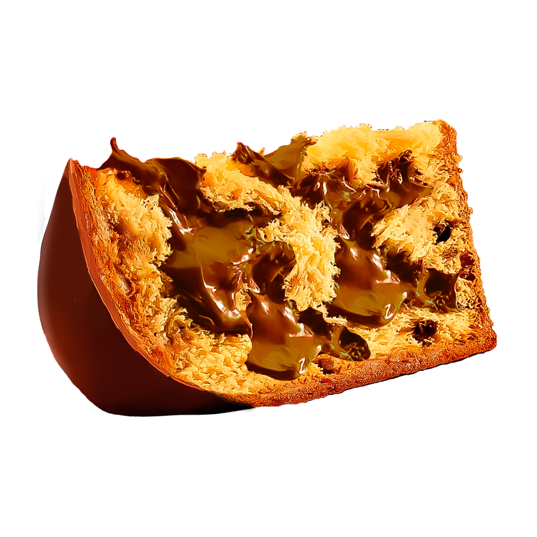 Panetone gotas de chocolate com recheio de doce de leite coberto com chocolate ao leite gourmet